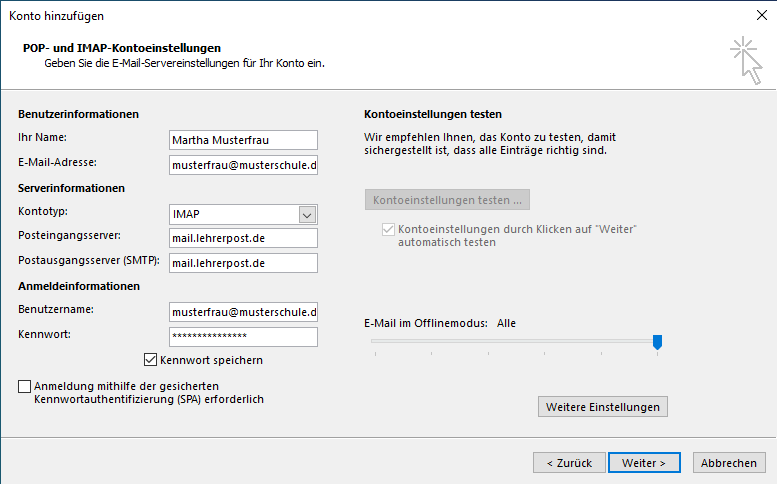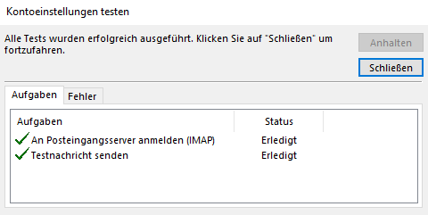 Nach einem weiteren Klick auf Weiter > testet Outlook die Einstellungen und im Erfolgsfall erhalten Sie folgende Rückmeldung: