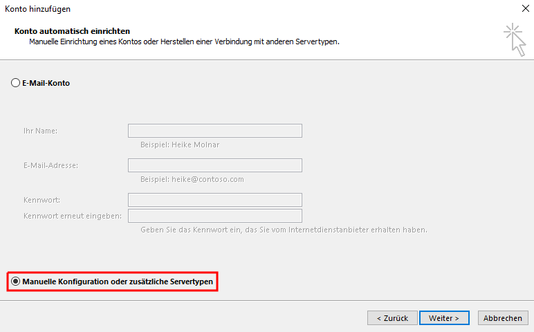 Im dritten Fenster wählen Sie „Manuelle Konfiguration oder zusätzliche Servertypen“ bevor es mit Weiter > zum nächsten Fenster geht:
