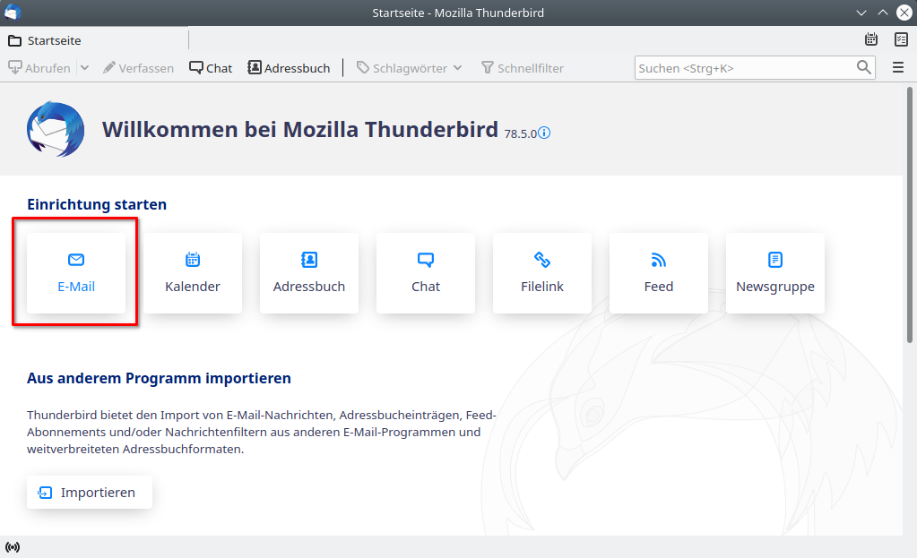 Starte die Einrichtung Deines Kontos. In einem frisch installierten Thunderbird geht das über die entsprechende Schaltfläche auf der Startseite