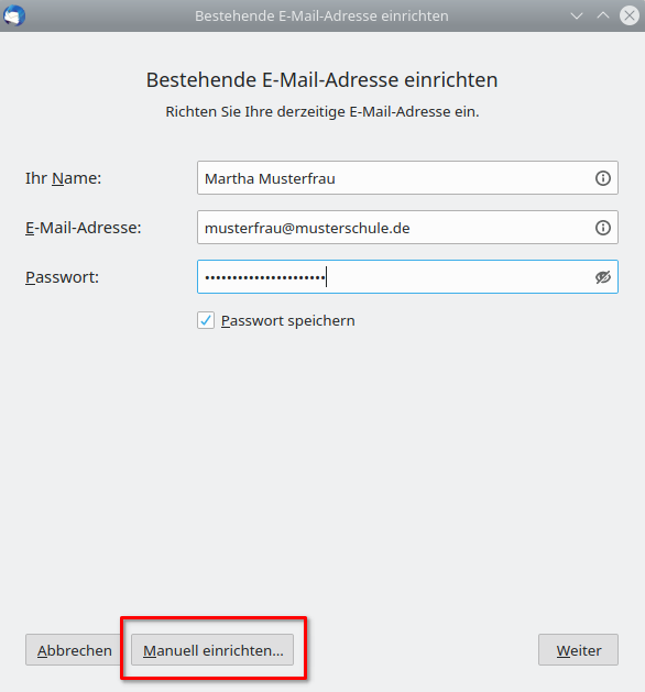 Gib im folgenden Fenster Deinen Namen, Deine E-Mail-Adresse und Dein Passwort ein und klicke auf Manuell einrichten…